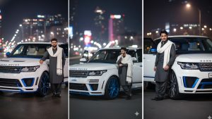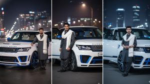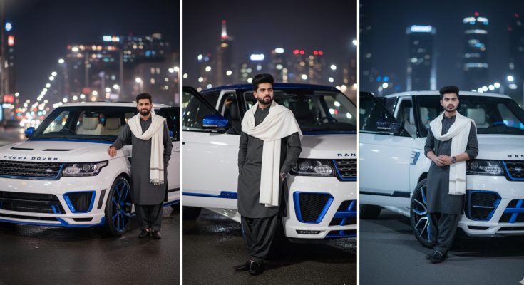 The man is wearing a dark shalwar kameez with a white shawl hung over one bear, dull shades, and cleaned dark shoes. The driver-side entryway of the car is open, and the headlights gleam warmly, including a cinematic touch to the scene. The environment has a blend of extravagance and style, idealize for a social media car way of life photo.