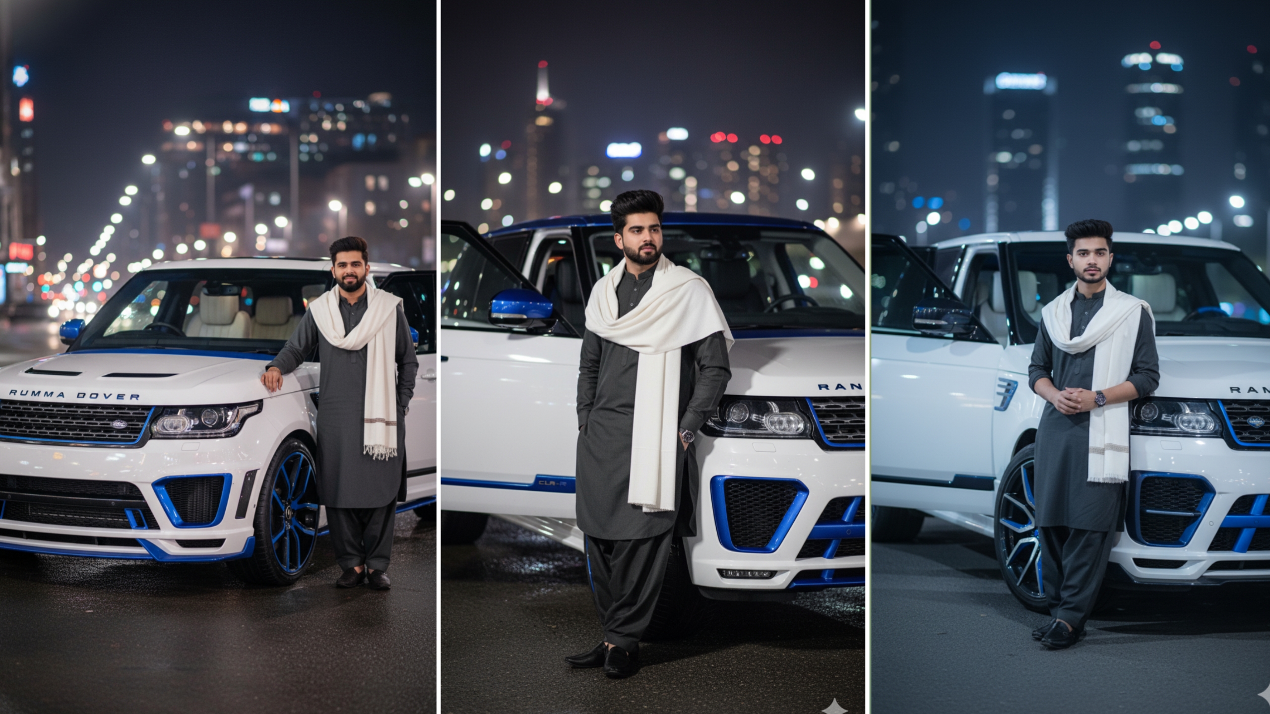 daytime running lights, and the front grille has been remodeled.White Lumma Design The CLR-R kit comes with a front spoiler bumper.turn this car left to right & Open Driver Side Door.He is wearing a dark gray shalwar kameez with a white shawl elegantly draped over one shoulder An urban night scene with blurred lights in the background (bokeh effect) Lighting The subject should be well-lit, possibly with a subtle rim light, to make them stand out against the darker background.