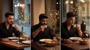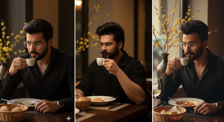 Use 100% face above uploaded photo A stylish man with black hair, and black beard, wearing clear-framed eyeglasses, sitting thoughtfully at a dimly lit restaurant table indoors during evening golden hour. He is holding a small white espresso cup near his mouth with one hand, the other resting on the table, wearing a black shirt unbuttoned at the collar. On the table: a glass of white wine, plates with food remnants, bread basket, and cutlery. Soft warm lighting with bokeh highlights, blurred background featuring delicate branches with small yellow flowers in a vase near a window, moody cinematic atmosphere, high detail, photorealistic, sophisticated men’s lifestyle and fashion photography, intimate and contemplative pose, don’t change the face.