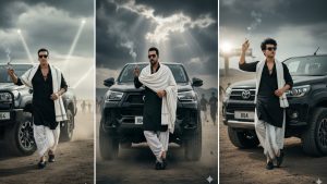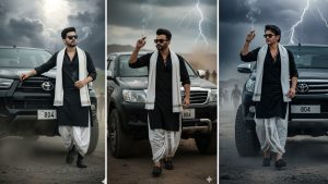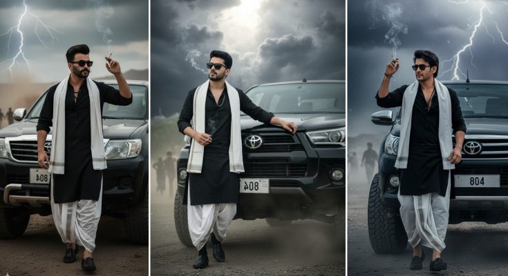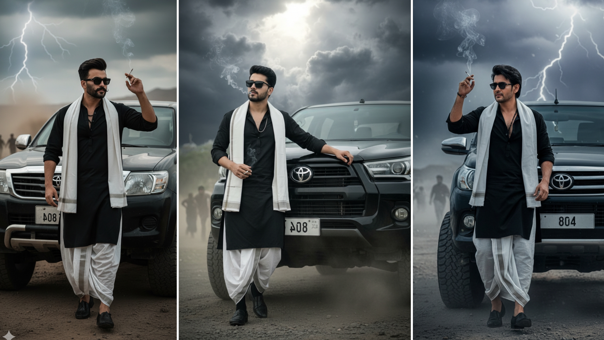 Ultra realistic, high-resolution cinematic poster of a boy Walking a rugged black off-road jeep. Flash light on cloudy sky. He has black hair, holding a lit cigarette above him as smoke curls. original face no edit the uploaded image, keeping the facial features exactly the same. He wears a black shalwar kameez. white shawl draped over his shoulders. Black sunglasses. Black classic shoes rolled up, unbuttoned slightly at the chest, revealing a beaded chain around his neck.His lower attire is a traditional crisp white veshti/dhoti with a shiny silver border, folded up in a rugged style, adding to his