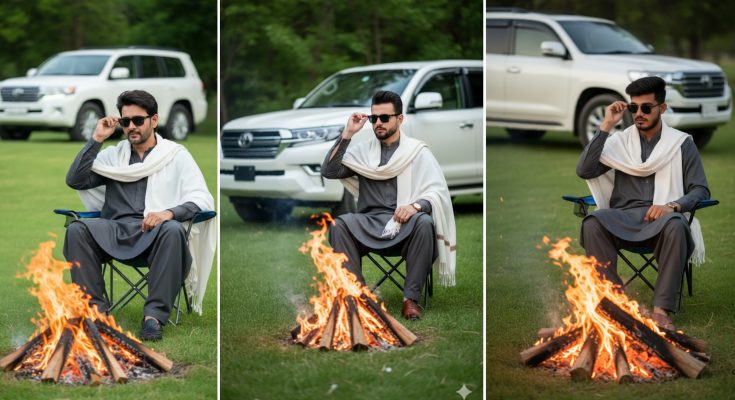A young man sitting Lawn outdoors near a campfire,He is wearing a dark gray shalwar kameez with a White shawl elegantly draped over one shoulder,Wearing Black Sunglasses One Hand On Sunglasses,He is sitting on a blue foldable camping chair,with a White Lc 300 In Background,Add Grass In Bottom,he focus is on the blazing campfire with glowing wood, and the relaxed mood of outdoor camping.Emphasize realistic lighting,