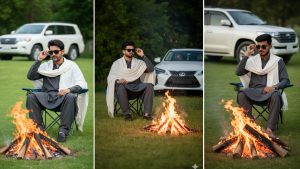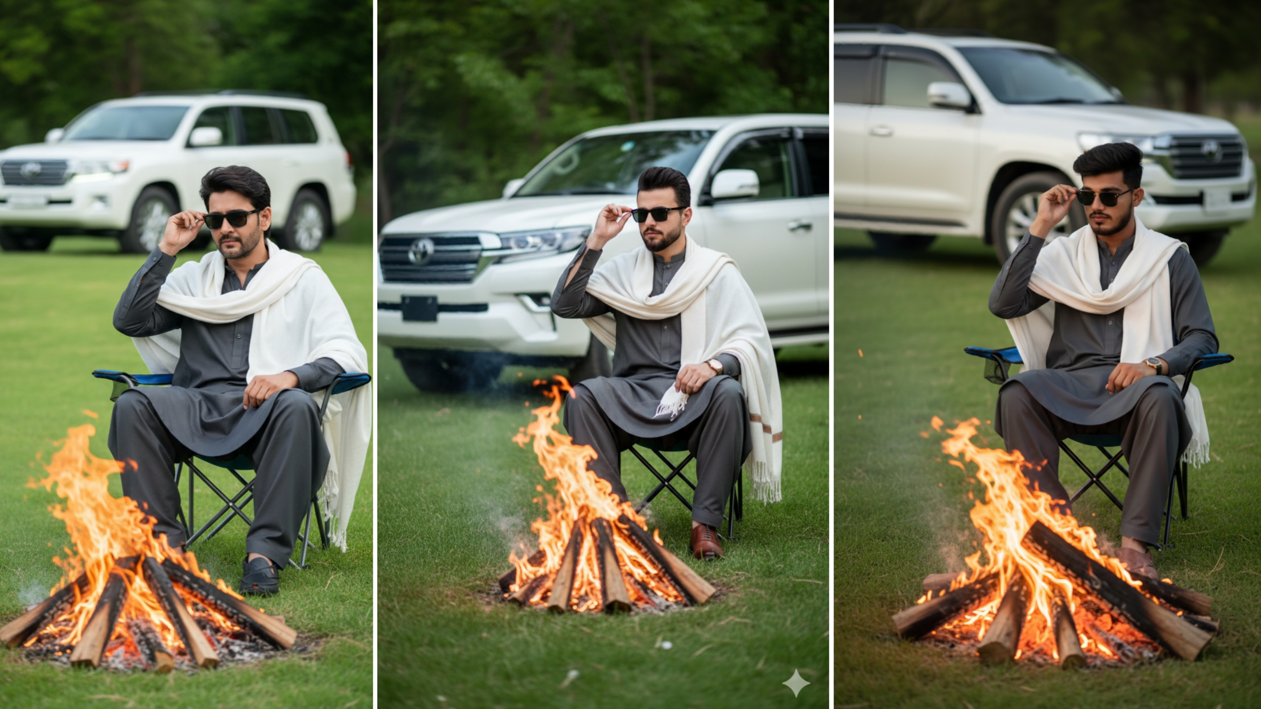 A young man sitting Lawn outdoors near a campfire,He is wearing a dark gray shalwar kameez with a White shawl elegantly draped over one shoulder,Wearing Black Sunglasses One Hand On Sunglasses,He is sitting on a blue foldable camping chair,with a White Lc 300 In Background,Add Grass In Bottom,he focus is on the blazing campfire with glowing wood, and the relaxed mood of outdoor camping.Emphasize realistic lighting,