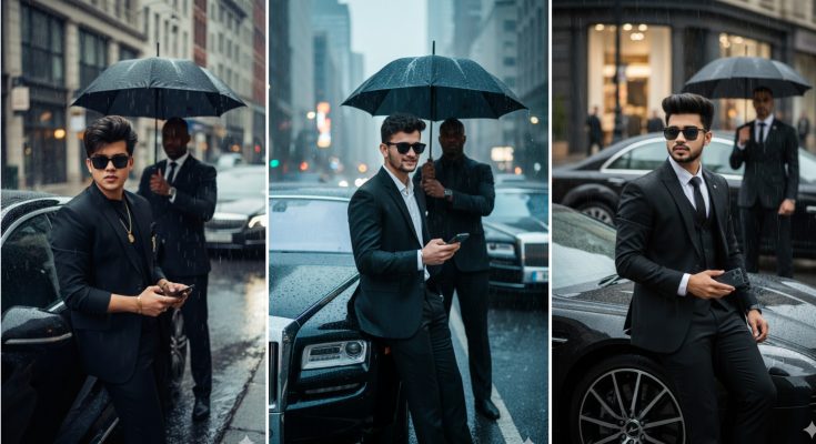 A young man leaning on the uploaded photo, wearing a black suit and sunglasses, holding a phone, while leaning against a luxurious black car. In the background, a bodyguard in suits with an umbrella and a car, set in a rainy city day, captured in a cinematic photography style, with no changes to the facial features or face angle.” Keep my face 100% same as in the reference image.