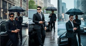 A young man leaning on the uploaded photo, wearing a black suit and sunglasses, holding a phone, while leaning against a luxurious black car. In the background, a bodyguard in suits with an umbrella and a car, set in a rainy city day, captured in a cinematic photography style, with no changes to the facial features or face angle.” Keep my face 100% same as in the reference image.
