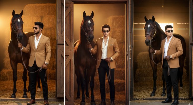 A high-resolution professional fashion portrait of the man from the reference image, maintaining his exact facial features and voluminous dark hair. He is 5’6″ and standing in the open doorway of a rustic wooden stable next to a magnificent, muscular dark brown bay horse with a small white star on its forehead. The man is wearing a tailored golden-tan camel-colored blazer, a crisp white dress shirt, and slim-fit black trousers. He is wearing dark sunglasses, a gold chain, and a gold watch, holding the horse’s leather lead rope with brown leather gloves. The horse is facing him. The background features bales of hay inside the stable, with warm golden-hour sunlight casting a dramatic, luxurious glow from behind. Photorealistic style, cinematic
