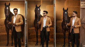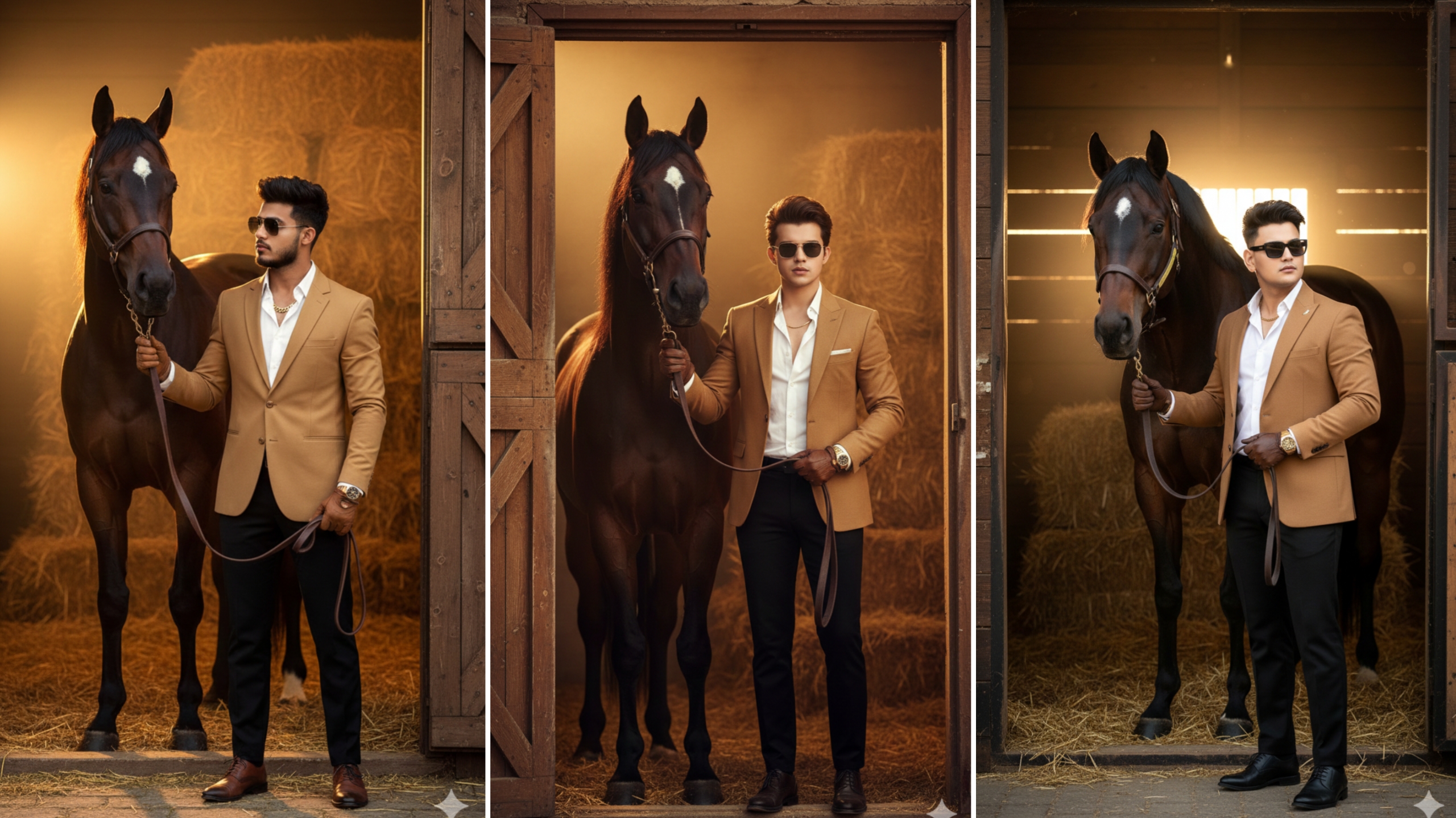 A high-resolution professional fashion portrait of the man from the reference image, maintaining his exact facial features and voluminous dark hair. He is 5’6″ and standing in the open doorway of a rustic wooden stable next to a magnificent, muscular dark brown bay horse with a small white star on its forehead. The man is wearing a tailored golden-tan camel-colored blazer, a crisp white dress shirt, and slim-fit black trousers. He is wearing dark sunglasses, a gold chain, and a gold watch, holding the horse’s leather lead rope with brown leather gloves. The horse is facing him. The background features bales of hay inside the stable, with warm golden-hour sunlight casting a dramatic, luxurious glow from behind. Photorealistic style, cinematic