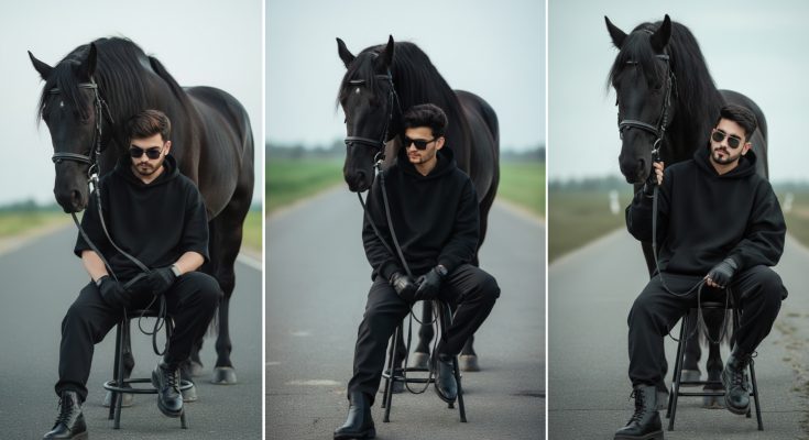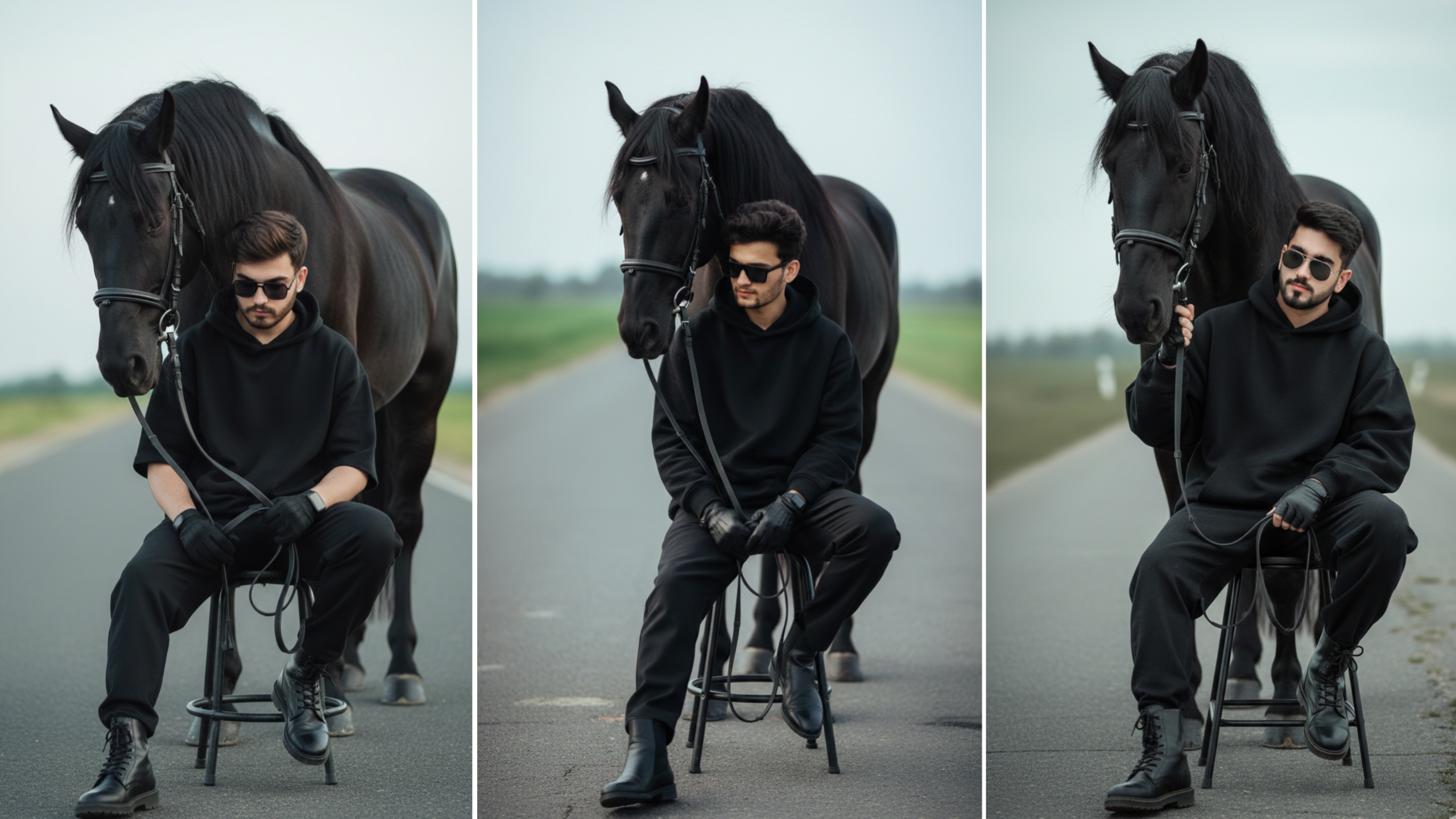 Ultra-realistic cinematic photograph of a young man sitting low on a simple black metal stool on an empty road. One leg stretched forward, relaxed grounded posture, shoulders slightly slouched, head tilted down with a calm, confident expression. Wearing an oversized black hoodie, dark loose trousers, black leather boots, gloves, and dark sunglasses. One hand resting between the knees holding thin black leather reins. A powerful black horse stands very close behind him, aligned protectively, head lowered near his shoulder, glossy coat and long mane, black bridle. Soft natural daylight, shallow depth of field, blurred green field background, cool muted tones, fashion editorial style, DSLR, 85mm, high detail, 8K.