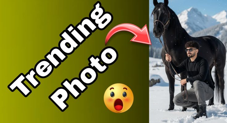 A hyper-realistic photograph of a man in a snowy mountain landscape, kneeling beside a majestic black horse. The man is wearing a black knitted sweater, gray cargo pants, black winter boots, and dark sunglasses. He is holding the horse’s reins confidently with one hand while kneeling in the snow. Snowflakes are gently falling around. The background shows tall snow-covered mountains and pine trees under a clear blue sky. The man’s face must remain exactly the same as in the reference photo provided, unchanged and highly detailed, with natural skin texture. The overall style should be sharp, cinematic, and realistic, like a professional outdoor photoshoot.