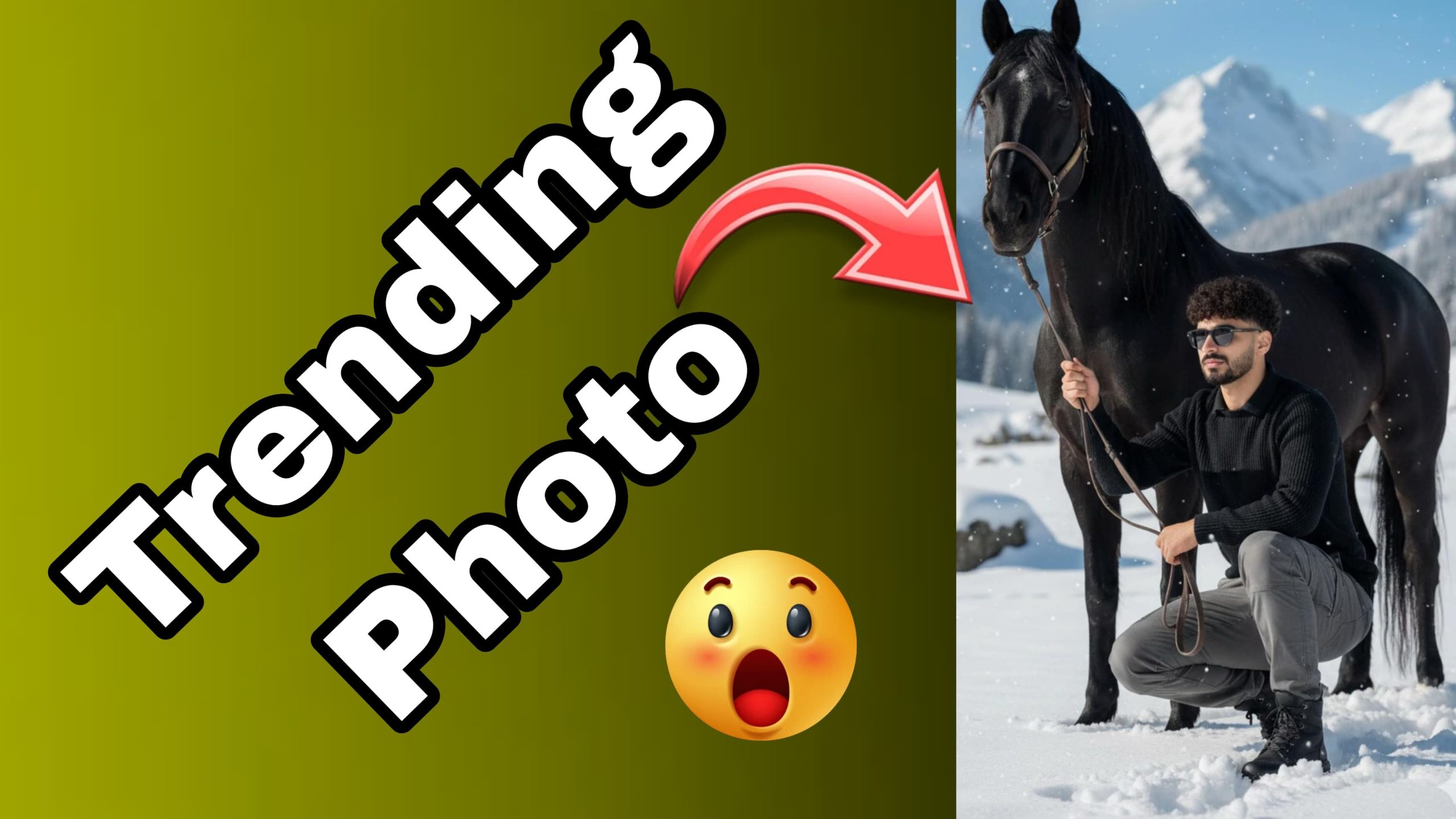 A hyper-realistic photograph of a man in a snowy mountain landscape, kneeling beside a majestic black horse. The man is wearing a black knitted sweater, gray cargo pants, black winter boots, and dark sunglasses. He is holding the horse’s reins confidently with one hand while kneeling in the snow. Snowflakes are gently falling around. The background shows tall snow-covered mountains and pine trees under a clear blue sky. The man’s face must remain exactly the same as in the reference photo provided, unchanged and highly detailed, with natural skin texture. The overall style should be sharp, cinematic, and realistic, like a professional outdoor photoshoot.