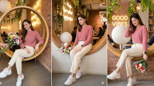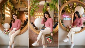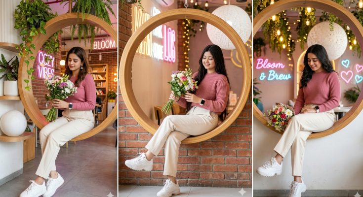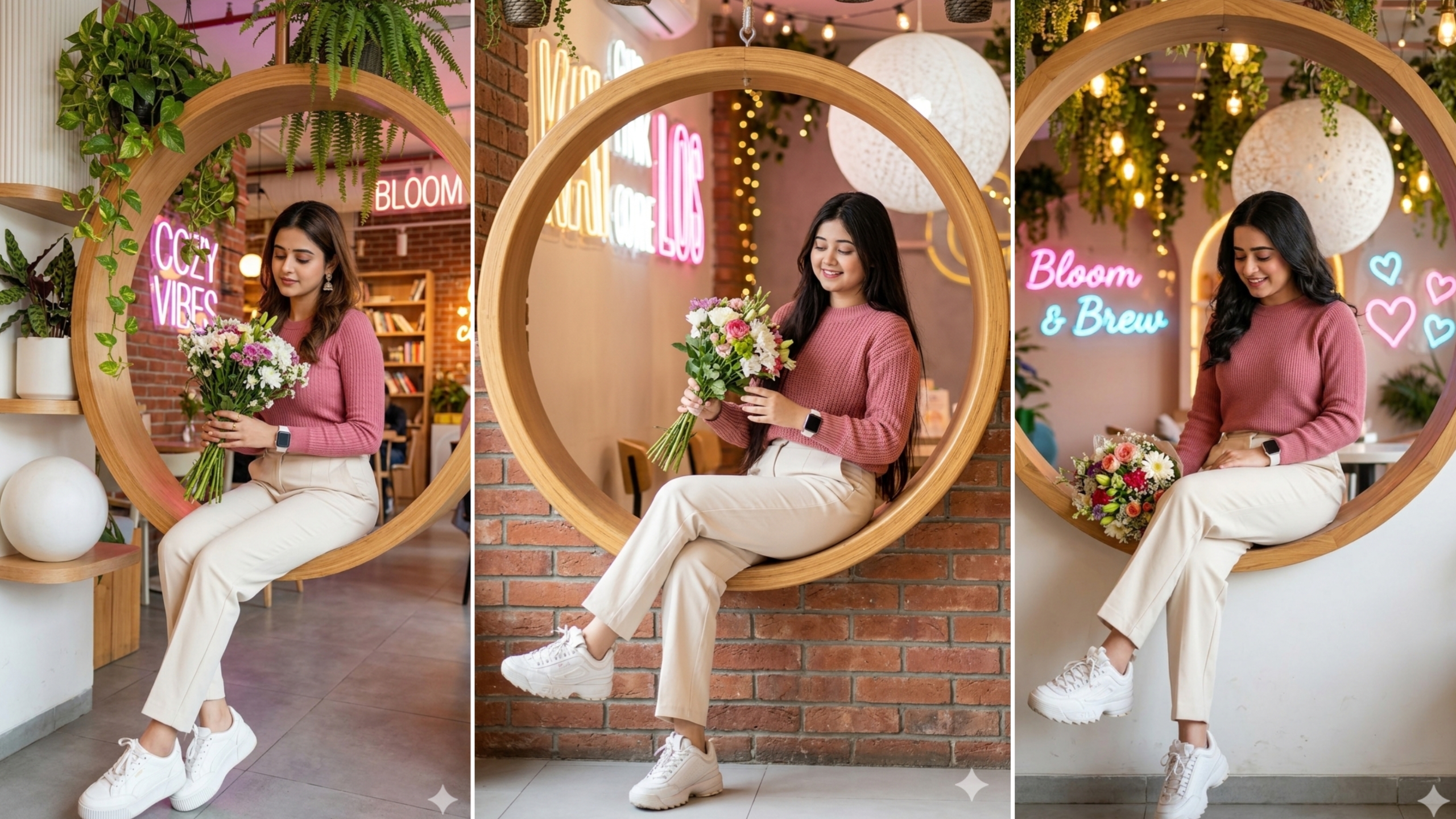 “A vibrant indoor lifestyle photo of a young woman sitting in a circular wooden hook on the wall, surrounded by hanging plants and neon lights, with a large white ball as part of the decor. Outfit: Stylish pink rose-colored full-sleeve blouse or chic sweater, paired with cream or light beige high-waist trousers, white Apple Watch, and trendy chunky white sneakers.