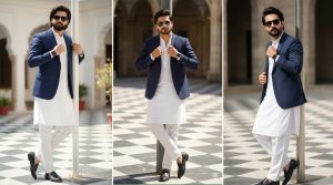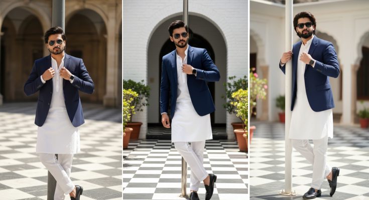 A stylish 18 year old man posing confidently outdoors in a bright courtyard with a checkered floor pattern. He is wearing a traditional all-white kurta and pajama outfit paired dark blue blazer,with black loafer shoes. His hair and beard style are the same as in the provided reference image (longish, swept-back hair; well-maintained, trimmed beard). He is accessorized with black sunglasses and a smartwatch. He is leaning casually against a vertical pole with one hand adjusting his kurta collar.