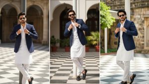 A stylish 18 year old man posing confidently outdoors in a bright courtyard with a checkered floor pattern. He is wearing a traditional all-white kurta and pajama outfit paired dark blue blazer,with black loafer shoes. His hair and beard style are the same as in the provided reference image (longish, swept-back hair; well-maintained, trimmed beard). He is accessorized with black sunglasses and a smartwatch. He is leaning casually against a vertical pole with one hand adjusting his kurta collar.